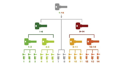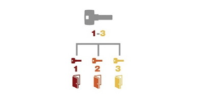 De grijze sleutel (directie laag) kan overal in en als enige in deur 7 en 8 (bijvoorbeeld het directiekantoor), de donkergroene sleutel kan overal in de regio Noord en de rode sleutel in regio Zuid. Sleutel 1-3 kan staan voor een filiaal waar ook verschillende lagen zijn. Zo krijgt de filiaal manager de midden groene sleutel (waar deur 1-3 mee open gemaakt kan worden), krijg het andere personeel alleen sleutel voor de voordeur 1, de leveranciers voor de sleutel voor de sluis om producten te lossen (deur 2) en het geldtransport de sleutel waar de kluis staat (deur 3) etc.